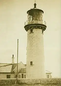 The English lighthouse of 1811 was equipped with 24 Argand lamps and reflectors, which displayed a fixed white light visible at a distance of up to 20 nautical miles (37 km; 23 mi).[3] In 1876 these were replaced by Trinity House with a fixed first order Fresnel lens array, designed and manufactured by John Hopkinson of Chance Brothers in Birmingham, UK.[9] After decommissioning, the lantern and optics of the English lighthouse were moved to Fehmarn island in the Baltic Sea where they were mounted at Staberhuk Lighthouse and are still in use today.[7]