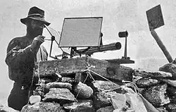 The heliotrope was limited to use on sunny days and was further limited (in regions of high temperatures) to mornings and afternoons when atmospheric aberration least affected the instrument-man's line of sight.[7] The heliotrope operator was called a "heliotroper" or "flasher" and would sometimes employ a second mirror for communicating with the instrument station through heliography, a signalling system using impulsed reflecting surfaces. The inventor of the heliograph, a similar instrument specialized for signaling, was inspired by observing the use of heliotropes in the survey of India.