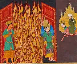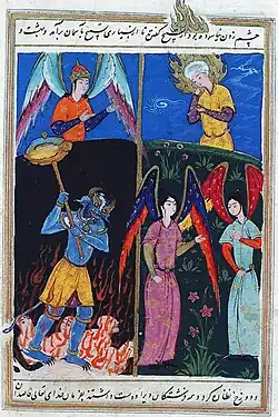 Maalik (left) and Jibril open the red gates of hell for Muhammad