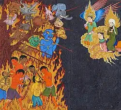 In Islam, Jahannam (in Arabic: جهنم) (related to the Hebrew word gehinnom) is the counterpart to heaven and likewise divided into seven layers, both co-existing with the temporal world,[104] filled with blazing fire, boiling water, and a variety of other torments for those who have been condemned to it in the hereafter. In the Quran, God declares that the fire of Jahannam is prepared for both mankind and jinn.[105][106] After the Day of Judgment, it is to be occupied by those who do not believe in God, those who have disobeyed his laws, or rejected his messengers.[107] "Enemies of Islam" are sent to hell immediately upon their deaths.[108] Muslim modernists downplay the vivid descriptions of hell common during Classical period, on one hand reaffirming that the afterlife must not be denied, but simultaneously asserting its exact nature remains unknown. Other modern Muslims continue the line of Sufism as an interiorized hell, combining the eschatological thoughts of Ibn Arabi and Rumi with Western philosophy.[104] Although disputed by some scholars, most scholars consider jahannam to be eternal.[109][104] There is belief that the fire which represents the own bad deeds can already be seen during the Punishment of the Grave, and that the spiritual pain caused by this can lead to purification of the soul.[110] Not all Muslims and scholars agree whether hell is an eternal destination or whether some or all of the condemned will eventually be forgiven and allowed to enter paradise.[108][111][112][113]