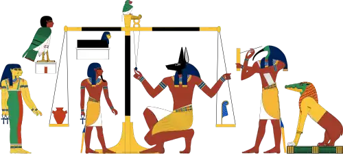 In this Book of the Dead scene, a person's heart is weighed on the scale of Maat against the feather of truth, by the canine-headed Anubis. The ibis-headed Thoth, scribe of the gods, records the result. If his heart is lighter than the feather, the person is allowed to pass into the afterlife. If not, he is eaten by the crocodile-headed Ammit.[17]