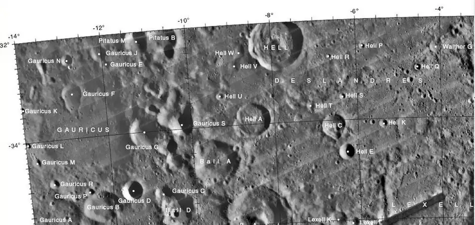 Hell is a lunar crater in the south of the Moon's near side, within the western half of the enormous walled plain Deslandres. To the southeast, also within Deslandres, is the larger crater Lexell, and about 9° to the south lies the prominent Tycho crater.[3] The crater received its name in 1935 after the Hungarian astronomer and ordained Jesuit priest Maximilian Hell.[4] It has 19 satellite craters with diameters ranging between about 3 and 22 km. Nearly all Hell craters are relatively flat and shallow, with a sharp, well-defined rim and a typical diameter-to-depth ratio of about 10.