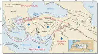 ![]() A combined diagram of the Aegean and Anatolian plates. The southern margin of the Hellenic arc is shown, which is the trend line of the faults separating the arc and the Hellenic Trench. The body of the arc is the chain called the outer Hellenides, which includes west Peloponnesus, Crete, Rhodes, southwestern Turkey, and all the islands between. | |