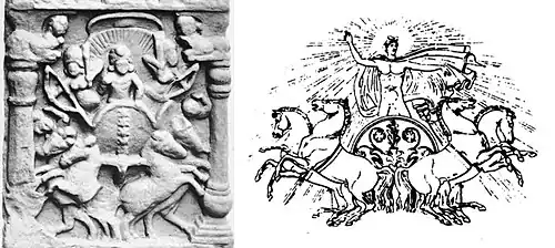 A famous relief from Bodh Gaya showing the Indian god Surya on a quadriga is also often mentioned as a possible example of Hellenistic influence on Indian art.[50][51] The Surya depiction is indeed very similar to some Greek reliefs of Apollo on his quadriga horse chariot. Other authors point to the influence of Greco-Bactrian coinage in which similar quadriga scenes sometimes appear, as on the coinage of Plato of Bactria.[51]