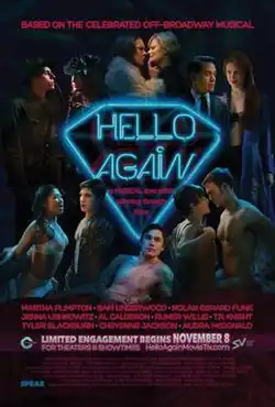 Hello Again is a 2017 American musical film directed by Tom Gustafson and written by Cory Krueckeberg. Based on the Off-Broadway musical of the same name by Michael John LaChiusa, the film stars Audra McDonald, Martha Plimpton, T. R. Knight, and Rumer Willis. The interconnected story is composed of 10 vignettes that follow lonely individuals pursuing romance across 10 different periods throughout New York City's history.