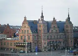 Formerly located on a sea bed, this station building rests on 1,600 poles embedded into the ground. It was designed by architect Niels Peder Christian Holsøe in collaboration with Heinrich Wenck in a Neo-Renaissance style locally known as Rosenborg Style after Rosenborg Castle in Copenhagen. It imitates Christian IV's Dutch Renaissance-style buildings from the first half of the 17th century and is characterized by red brickwork combined with sandstone ornamentation Dutch gables and an abundance of turrets with copper-clad spires.