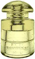 Hemingray was best known for producing telegraph and telephone pin insulators used on utility poles. To give an overview of the large variety of styles produced, the following table contains the twenty most common.[2] The table provides two numbers: the Consolidated Design (CD) number and the style number. The CD number is from a classification system developed by collectors that refers to the shape of the insulator, and is independent of the Hemingray Glass Company.[3] However, the style number (or name) was assigned by Hemingray to each insulator. Due to slight modifications in design over years of production, single styles can span multiple CD numbers.