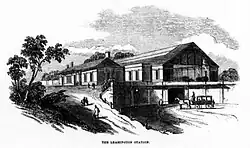 In 1874 Finch was said to have committed 'an indiscretion' towards officials at Leamington railway station, and it was stated that he had made a payment to apologise.[38] The Birmingham Daily Post reported that while Queen Victoria's train had been waiting at Leamington station on Wednesday 20 May 1874, Finch had arrived with his local Yeomanry Company to give the Queen an Honour Guard. The Company arrived at Leamington station at around 10 p.m., and Finch had been refused entry by station porters due to the Queen's wish for privacy. Finch had dismounted his horse to try to gain admittance and 'an unseemly hand to hand struggle ensued.'[25] The Kenilworth Advertiser reported that one witness claimed to have seen a Yeomanry member with a sword drawn threatening to cut down a station porter, though the Advertiser's reporter hoped this was an exaggeration.[39] The incident was discussed In the House of Commons on 4 June 1874: MP Lewis Dillwyn raised a question about reports of the event. The Minister of War Gathorne Gathorne-Hardy explained that enquiries had been made of the parties concerned, and that Finch's Yeomanry had waited 'perfectly quiet' outside the station while Finch had tried to gain admittance, but Finch had resisted when physically restrained by station staff. Finch had extricated himself, and then spoke with the Queen's Private Secretary General Ponsonby though the station's railings, who told him: "Her Majesty did not wish to hurt his feelings at all, but wished that her stay in the station should be quite private," after which Finch and his company had withdrawn.[24] An obituary for Finch asserted that the compensation payment made at the time was because Finch had punched the Station Master[27] [the original Leamington railway station buildings were demolished in the 1930s: the modern Leamington Spa railway station is now on the same site[40]].