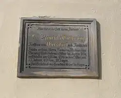 Plaque on the wall of the Lutheran church in Großhennersdorf commemorating the place of eternal rest of Henriette von Gersdorff