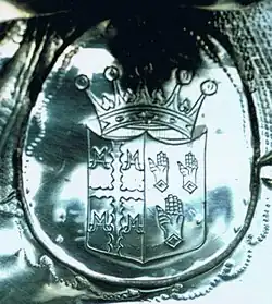 {{citation}}: CS1 maint: location missing publisher (link) - "Bourchier, Rachel, Countess of Bath (1613 – 1680) (Stamp 1)", British Armorial Bindings, University of Toronto Libraries – "cross engrailed betweengauntlets (3)water bougets (4)"