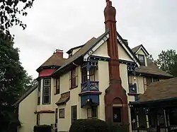 Its many porches, turned posts, balconies, porte-cochere and chimney with divided flues (to allow space for a window to be placed in the center of its base) are the best details of their type in Medford. Mentioned in a deed of 1882, the house was probably constructed between March 1881 when the one and three-quarter acre [7,100  m3] parcel on which it stood was first surveyed, and April 1882, when Dudley Bradlee granted a mortgage on the property to Henry Bradlee and his wife, Maude.