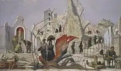At the outbreak of World War II, Carr was offered commissions by the War Artists' Advisory Committee to paint scenes of bomb damage in London, both to landmarks such as St Pancras railway station and St Clement Danes Church and to housing in the suburbs. An exhibition of his war paintings was held at the National Gallery in July 1940.[3] Carr's own home and studio were destroyed in the Blitz.[4] A trip on a British merchant navy ship resulted in the paintings The Merchant Navy:The Chain Locker and Merchant Seaman Fireman. In 1943 Carr became a full-time, salaried, War Office Artist and travelled first to North Africa and then to Italy. As well as portraits of Allied soldiers and officers, he painted military actions and landscapes in Algiers, Tunis, Cassino and Sessa in Italy. In 1944, he witnessed, and painted, an eruption of Mount Vesuvius. Later in 1944 he left Italy after becoming ill.[5]