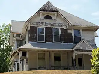 This 2½-story, clapboard house was designed in the Queen Anne style. It features a hip roof, full height gable projections, a polygonal bay on the south side, and a porch on the east and south sides. The gable ends have a sunburst motif and dental moldings on the front and above the main entrance. Shingling is located between the floors of the polygonal bay and on the front gable. The porch features an Eastlake balustrade.[4] The house is situated on a high hill above the street with large trees in the yard.