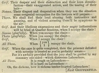 During the break in his Parliamentary career, Labouchère gained renown as a journalist, editor, and publisher, sending witty dispatches from Paris during the Siege of Paris in 1870–1871, noting the eating of zoo elephants, donkeys, cats and rats when food supplies ran low.[16] This series of articles helped restore the circulation of the Daily News, in which he had bought a stake in 1868. His unflinching style gained a large audience for first his reporting, and later his personal weekly journal, Truth (started in 1876), which was often sued for libel.[17] With his inherited wealth, he could afford to defend such suits.[1] Labouchère's claims to being impartial were ridiculed by his critics, including W. S. Gilbert (who had been an object of Labouchère's theatrical criticism) in Gilbert's comic opera His Excellency (see illustration at right). In 1877, Gilbert had engaged in a public feud with Labouchère's lover Henrietta Hodson.[18]