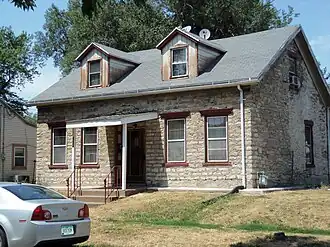 The house is constructed of limestone. Typical elements of Davenport's early homes that are found in this structure are the single story, side-gable roof, and the entrance on the long side of the house.[2] The only style elements of the house are found in its symmetry and the molded cornices above the windows and door.[3]