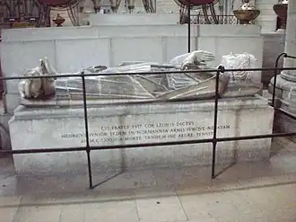 At Le Mans, the local bishop halted the procession and ordered the body buried in his cathedral, perhaps to help defuse the civil unrest Henry's death had caused. The dean of Rouen recovered the body from the chapter of Le Mans a month later by a lawsuit so that the Young Henry could be buried in Normandy as he had desired in his testament.