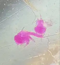 The flecked box crab is an opportunistic predator meaning they will tend to eat whatever comes across their path.[7] Because there tends to be a larger food source for these crabs during the summer, mating and therefore offspring increases when more food is available.[2] Reproduction usually occurs mostly in the spring and then again with reduced numbers in the fall.[8] Sexually mature males tend to be seen more often during late spring and summer[6] while females tend to reach sexual maturity in the late winter and early spring months.[8] Sexually mature males can mate with females in the winter and the females will hold the sperm until spring (which is the biggest time for mating but it still occurs continuously throughout the year).[8] Female crabs mate with males and store their sperm in an organ called the spermetheca, where they can then use it to fertilize their eggs a number of times.[8]