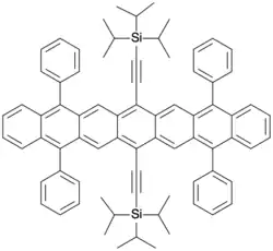 Heptacene is an organic compound and a polycyclic aromatic hydrocarbon and the seventh member of the acene or polyacene family of linear fused benzene rings.[1] This compound has long been pursued by chemists[2][3][4] because of its potential interest in electronic applications and was first synthesized but not cleanly isolated in 2006.[5][6] Heptacene was finally fully characterized in bulk by researchers in Germany and the United States in 2017.[7]