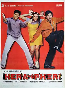Hera Pheri (transl. Foul Play) is a 2000 Indian Hindi-language comedy film directed by Priyadarshan and written by Neeraj Vora, starring Akshay Kumar, Suniel Shetty, Paresh Rawal, Tabu, Om Puri and Gulshan Grover.[4] The film is a remake of 1989 Malayalam film Ramji Rao Speaking which itself was inspired by the 1971 American TV movie See The Man Run.[5][6][7] It is the first instalment of the Hera Pheri franchise. The plot revolves around two tenants, Raju and Shyam, and their landlord, Baburao Ganpatrao Apte, who are in desperate need of money. They chance upon a ransom call through a cross-connection and hatch a plan to claim the ransom for themselves.