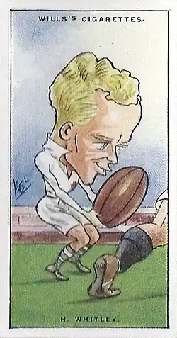 Whitley, a half-back, was considerably lightweight at around 60 kg.[2] He had yet to represent England when he won a place on the 1924 British Lions tour to South Africa, where he played three of the four international matches against the Springboks. His solitary England cap came in a 1929 Five Nations win over Wales at Twickenham.[3]