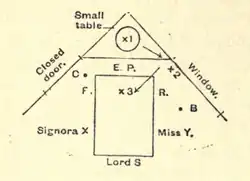 In 1908, the Society for Psychical Research (SPR) appointed a committee of three to examine Palladino in Naples. The committee comprised Mr. Hereward Carrington, investigator for the American Society for Psychical Research and an amateur conjuror; Mr. W. W. Baggally, also an investigator and amateur conjuror of much experience; and the Hon. Everard Feilding, who had had an extensive training as investigator and "a fairly complete education at the hands of fraudulent mediums."[19] Three adjoining rooms on the fifth floor of the Hotel Victoria were rented. The middle room where Feilding slept was used in the evening for the séances.[20] In the corner of the room was a séance cabinet created by a pair of black curtains to form an enclosed area that contained a small round table with several musical instruments. In front of the curtains was placed a wooden table. During the séances, Palladino would sit at this table with her back to the curtains. The investigators sat on either side of her, holding her hand and placing a foot on her foot.[21] Guest visitors also attended some of the séances; the Feilding report mentions that Professor Bottazzi and Professor Galeotti were present at the fourth séance, and a Mr. Ryan was present at the eighth séance.[21]