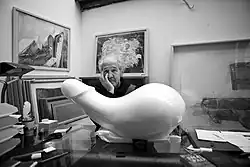 ![]() Herman Makkink and his most famous work, Rocking Machine, which appeared prominently in the Stanley Kubrick film A Clockwork Orange | |