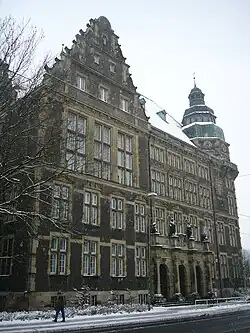 There are four small statues located above the main entrance. One of them shows Goethe and another one Copernicus. The other two statues represent science and cosmopolitanism.