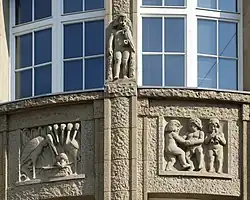 Shortly after his arrival there, he became a member of the progressive artists' group, Malkasten and, with some short interruptions, would remain a member for the rest of his life. In 1911 and 1913, he participated in the Große Kunstausstellung NRW Düsseldorf, with a series of bronze statuettes in the Art Nouveau style.[2] Some were also shown at the Große Berliner Kunstausstellung of 1917. That same year, he began work on a memorial to the war dead, at the Nordffriedhof, designed by the architect, Hermann Goerke. It occupied him until 1921 and is one of his most individually prominent works.