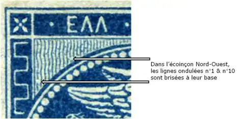 The Greek workers were far to have the level of experience of the French ones who were used to printing methods since several generations... Thus, the result was disappointing, the background of the medallion was not uniform anymore, the Hermes head was very often circled by a whitish halo and the four spandrels were also often "unclear". The shadow lines of the cheek and the nape are now continued and thicker than on the Paris printings.