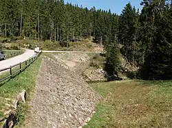 The Herrenwieser Schwallung is a splash dam, built in 1844–47 of bunter sandstone, near Herrenwies in the Black Forest, which impounds the waters of the Schwarzenbach stream into a pond. In the days of timber rafting it was periodically opened and washed the fallen logs or timber rafts downstream into the valley. Today the dam acts as a bridge over the Schwarzenbach.