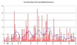 In April 2009, his sixteen One Day International innings since the March 2008 one-day series in Bangladesh having yielded just three fifties, even Stuart Hess, his most ardent media supporter, was moved to cast doubt over his future. Hess had famously recommended Gibbs as captaincy successor to Shaun Pollock in 2003, but now, noting that his "average, as an opener, in that same period is 25.25, more than 10 runs below his overall average of 35.87", Hess felt "a sense that Gibbs is living off past deeds and not playing with the requisite form needed to hold on to a national spot."[17] He noted, however, that Gibbs was the only South African with more than 1,000 World Cup runs and that, of the twelve others, only Sachin Tendulkar with 57.93 and Sir Viv Richards with 63.31 had better averages:
