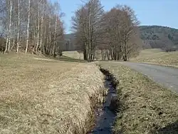 The Herzbach rises on the Herzberg (427 m) in the Huckelheimer Forest, northeast of Oberwestern in the Herzborn.