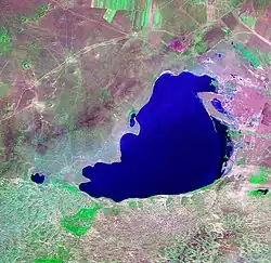 Dali Nur (Chinese 达里诺尔 or 达来诺尔) is a lake in the western part of Hexigten Banner, with several park areas near its shores. The Dali Nur volcanic group (达里诺尔火山群) lies on the northwest shore. Volcanic features include a basalt plateau and the large "plugs" of extinct volcanos, which once formed islands in the lake when water levels were higher. The plugs are now isolated hills.[10]