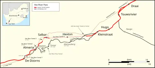 The four Hex River Tunnels consist of a twin tunnel of 500 m (0.31 mi) and three single tunnels of 1.1 km (0.68 mi), 1.2 km (0.75 mi) and 13.5 km (8.39 mi), on the Hexton railway route between De Doorns and Kleinstraat through the Hex River Mountains of the Western Cape Province, South Africa. The line, which connects De Doorns in the Hex River valley with Touws River in the Great Karoo, is part of the main rail route between Cape Town and Johannesburg. Of the 30 kilometres (18.64 miles) of track, 16.8 kilometres (10.44 miles) are underground. Construction of the line eliminated the bottleneck of the Hex River rail pass.[1][2][3]