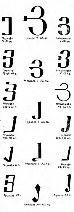 Hi, or Yi (uppercase: Յ; lowercase: յ; Armenian: հի; Classical Armenian: յի) is the 21st letter of the Armenian alphabet. It is pronounced as the voiced palatal approximant [j], or the voiceless glottal fricative [h] word-initially and silent word-finally in Classical Armenian orthography.[1] It is typically romanized with the letter H, J or Y.[2] Created by Mesrop Mashtots in the 5th century, it has a numerical value of 300.[3]