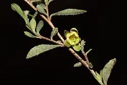 Hibbertia pallidiflora is usually a dense shrub that typically grows to a height of up to 1.5 m (4 ft 11 in) and has hairy, scrambling branches. The leaves are egg-shaped to lance-shaped with the narrower end towards the base, 2.3–10.4 mm (0.091–0.409 in) long, 0.9–6.5 mm (0.035–0.256 in) wide on a petiole 0.2–0.9 mm (0.0079–0.0354 in) long, and with the edges more or less turned down. The flowers are arranged singly on the ends of side shoots on a peduncle 2–9.5 mm (0.079–0.374 in) long with a single linear to lance-shaped bract 1.2–2.2 mm (0.047–0.087 in) long at the base. The five sepal are joined at the base, the lobes 2.1–3.9 mm (0.083–0.154 in) wide, the inner lobes slightly shorter than the outer ones. The petals are cream-coloured to pale yellow, egg-shaped with the narrower end towards the base, 1.3–2.5 mm (0.051–0.098 in) long with eight to thirteen stamens joined at the base, on one side of the two carpels, each carpel usually with two ovules. Flowering mostly occurs from August to November.[2][3][4]