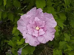 Hibiscus syriacus is a hardy deciduous shrub. It is upright and vase-shaped, reaching 2–4 m (7–13 feet) in height, bearing large trumpet-shaped flowers with prominent yellow-tipped white stamens.[12] The flowers are often pink in color, but can also be dark pink (almost purple), light pink or white. Individual flowers are short-lived, lasting only a day. However, numerous buds produced on the shrub's new growth provide prolific flowering over a long summer blooming period. The soil in which the Hibiscus thrives is moist but well-drained, and organically rich.[13] Hibiscus syriacus is highly tolerant of air pollution, heat, humidity, poor soil and drought.[13] The species has naturalized very well in many suburban areas and might even be termed slightly invasive, so frequently does it seed.[2]