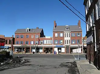 The Hickey—Osborne Block is a historic commercial-residential building in Peabody, Massachusetts. It is a distinctive repurposing of three residential structures, dating as far back as 1797, by raising them and building brick commercial ground floors beneath them. The building was listed on the National Register of Historic Places in 1985.[1]