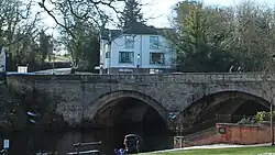 A bridge over the river at this location was first recorded in 1200. The bridge was built in stone in the 14th century, three metres wide with rib vaulting and pointed arches. It was rebuilt in 1773, incorporating the original structure but four metres with and with skewed end points on the banks, and a toll gate was added. The bridge was widened upstream in the 19th century, and in the 1920s, it was widened on both sides, and new parapets were constructed.[1] It was grade II listed in 1952.[2]
