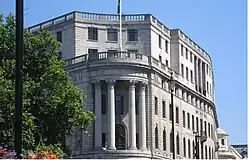 South Africa House was built by Holland, Hannen & Cubitts in the 1930s[4] on the site of what had been Morley's Hotel.[5] The building was designed by Sir Herbert Baker, with architectural sculpture by Coert Steynberg and Sir Charles Wheeler, and opened in 1933.[6] The building was acquired by the government of South Africa as its main diplomatic presence in the UK. During World War II, Prime Minister Jan Smuts lived there while conducting South Africa's war plans.