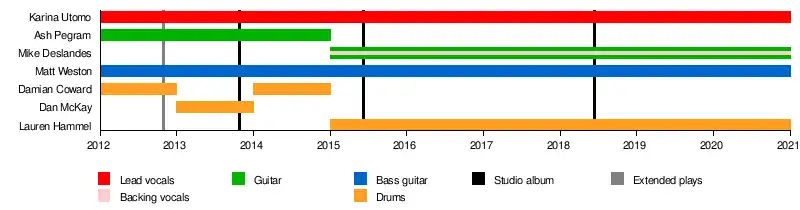 Formed in 2012,[1] the band's original line-up featured Karina Utomo and Ash Pegram from Young and Restless with Matt Weston from The Nation Blue[2] and Damian Coward from Love Like...Electrocution. Only Utomo and Weston remained from the original line-up throughout; the final line-up of the band featured guitarist Mike Deslandes (also of YLVA), and drummer Lauren Hammel.