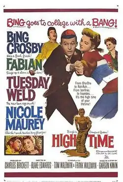 High Time is a 1960 American comedy film directed by Blake Edwards and starring Bing Crosby, Fabian, Tuesday Weld, and Nicole Maurey. The film is told from the perspective of middle-aged man Harvey Howard who enters the world of a new generation of postwar youth.