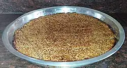 In Palestinian cuisine, Hilbeh, Hulbah, or Fenugreek Cake (Arabic: حلبة) is a dessert made from fenugreek seeds, olive oil, and semolina, topped with nuts, nigella seeds, or sesame, then coated in sugar syrup, which soaks into the cake.[1]