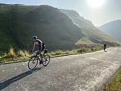 Hill climbing is a cycling event, as well as a basic skill of the sport. As events, a hill climb may either be an individual time trial (which forbids cooperation, drafting, or team tactics), a road race or in some cases a gravel race. A hill climb is a competition of sustained climbing, that finishes at a higher altitude than the start line.[2] Occasionally featured as stages in major professional races, such as the Tour de France, they are usually referred to as mountain stages. Mountain stages may take the form of a normal road race stage, or an individual time trials. Time trial stages are not necessarily from the bottom to the top of a hill, and can simply be a time trial over hilly terrain.[3]