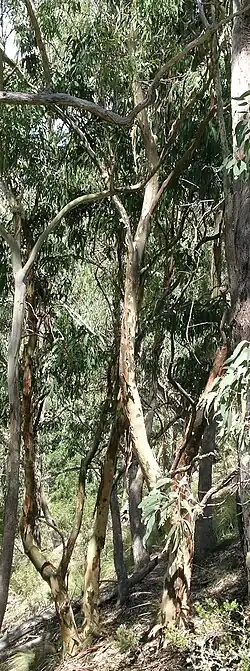 Long Point campground is 18 km south of Hillgrove in the wilderness of Oxley Wild Rivers National Park. There are two posted walking tracks through dry rainforest and around the rim of the gorge offering good views over the Chandler and Macleay River systems. The overnight Chandler River Walk to Wollomombi starts here. Some rare Eucalyptus michaeliana (Hillgrove Gum) trees may be seen growing along the Long Point Road. These trees have a distinctive, mottled, greenish trunk with peeling yellow-brown bark (like jigsaw puzzle pieces). Its range is restricted to Mount Barney National Park in Queensland and in NSW to the Wyong and Hillgrove areas.