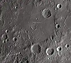 Hipparchus is the degraded remnant of a lunar impact crater. It was named after the Greek astronomer, geographer and mathematician Hipparchus.[1] It is located to the southeast of Sinus Medii, near the center of the visible Moon. To the south is the prominent crater Albategnius, and to the southwest lies Ptolemaeus, a feature of comparable dimensions to Hipparchus. Horrocks lies entirely within the northeast rim of the crater. Halley is attached to the south rim, and Hind lies to the southeast. To the north-northeast is the bowl-shaped Pickering, and the flooded Saunder is located off the northeast rim. High-resolution images of Hipparchus were obtained by Lunar Orbiter 5 in 1967.