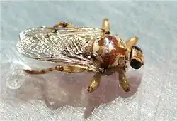 Hippobosca longipennis (Diptera: Hippoboscidae), the dog fly, louse fly, or blind fly, is a blood-feeding parasite mostly infesting carnivores.[8] The species name "longipennis" means "long wings".[9] Its bites can be painful and result in skin irritation, it is an intermediate host for the canine and hyaenid filarial parasite Dipetalonema dracunculoides, "and it may also be a biological or mechanical vector for other pathogens".[8][10]