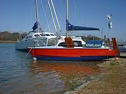 The Hirondelle is a fibreglass cruising catamaran, 23 feet (7.0 m) in length, with a beam of 10 feet (3.0 m), and in its standard configuration has 4 or 5 berths. Based on Chris Hammond's 20 ft (6.1 m) 'Meon' cold-moulded/sheet-plywood catamaran of 1967–8, the original design was bought by Brian Carvill in 1969, modified, renamed Hirondelle, and manufactured in fibreglass by Robert Ives Boatbuilders in Christchurch, England.