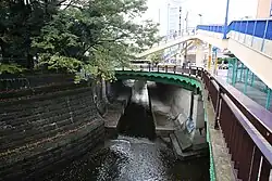 Tengenji Bridge (天現寺橋) is located at the intersection of Gaien-Nishi-dori and Meiji-dori in Hiroo 5-chome. The bridge spans the confluence of the Shibuya River and the Kogai River. The Kogai River flows completely underground since it was covered by concrete. The Kogai River flows under Gaien-Nishi Dori upstream towards and past the east side of Aoyama Cemetery. Two springs known to still flow into the Kogai River are located at the ponds of Arisugawa Park and the ponds at the Nezu Museum. The Tengenji Bridge is an old bridge and existed long before it was mentioned in a text named Gofunaienkakuzsho (御府内沿革図書) published in Bunkyu 3 (1863).