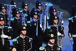 Being the most visible part of the company, the band provides musical accompaniment for all state ceremonies foreign and domestic. Everyone who enters the band must audition prior to joining, which are usually held in the spring.[2] It is an integral part of the Norwegian Military Tattoo, which it participates in due to it being part of the Forsvarets musikk (English: Defence Music). Uniquely, the band consists of about 50% conscript women musicians and field musicians, compared to 17% in the rest of the armed forces.[3] Signal Corps buglers are constantly on guard duty at the Royal Palace and as weekly ceremonial buglers (UKHB) in Huseby Leir. They have the responsibility to play bugle calls during the raising and lowering of the Flag of Norway, the start of lunch and during the mail rounds for the battalion.